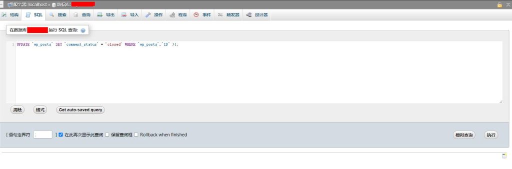 如果需要批量设置wordpress文章的评论选项,在phpmyadmin或者mysql命令行里运行sql语句就可以: 如图所示: 批量关闭文章评论: UPDATE `wp_posts` SET `comment_status` = 'closed' WHERE `wp_posts`.`ID` >1; 批量开启文章评论: UPDATE `wp_posts` SET `comment_status` = 'open' WHERE `wp_posts`.`ID` >1......