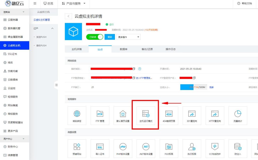 融亿云的云虚拟主机怎么打开详细错误? 首先登录控制台,然后点击云虚拟主机,点击管理,随后点击站点 在常用操作内,找到主机运行模式并打开 在随后的选项选择调试模式 然后点击确定就可以,再访问自己的域名,就可以查到具体错误的原因了。 安全建议:在排查处理完问题后改回发布模式,可以减少虚拟主机的安全风险